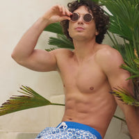 Made from 100% recycled polyester, with summery blue and white pattern. Features orange detailing.